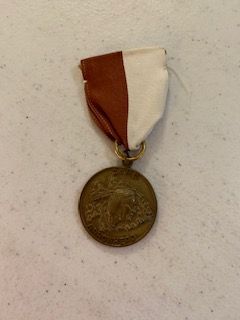 Description: Camp Arrowhead Jr. Camper Award medal, inscribed on reverse side with L.A.Longfellow, maroon and white ribbon attaching medal, designed as a pin which has broken since donation.