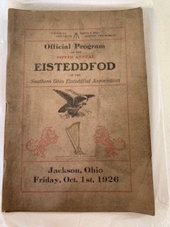 Description: two Official Programs of 1926 fifth annual Southern Ohio Eisteddfod Association event, dirty covers from storage in the organ cabinet at FPC, likely by John E. Jones, member of church and director of event.