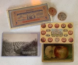 .007 color postcard, undated, Jackson County Apples, 11 apples pictured, tree with blossoms;