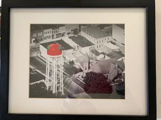 Description: framed b/w photo of Church St. and Main St. in Jackson OH with apple water tower in red