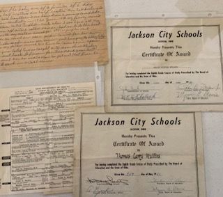 .107 Jackson City Schools Certificate of Award eighth grade completion for Thomas Larry Mullins May 1962;