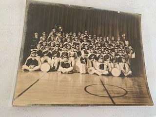 .002 unmarked photo of Jackson High School band, no date, no names, seemingly taken on auditorium stage of JHS Tropic & Vaughn street, photo appears in 1934 Osky Wow with description of band and events.