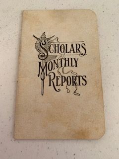 Description: “Scholars Monthly Report” report for school year 1908, Elsie Wallace, a pupil in Junior Class of Jackson High School, graduate 1910, Married Arthur Bennett, Mother of Wendel Bennett.