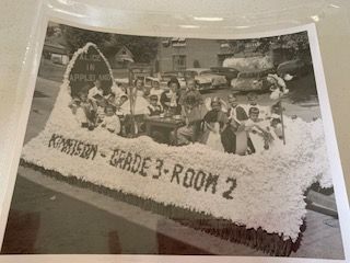 Description: Black and White photo of Alice in Appleland float, Kinnison School, Grade 3, room 2. Photo taken near Portsmouth Street.