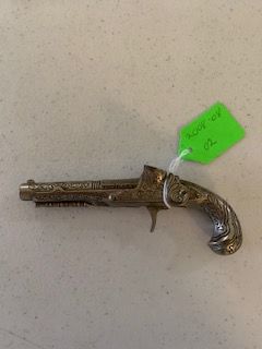 Description: 6-inch metal toy gun, silver, Hubley flintlock midget brand, made in USA.