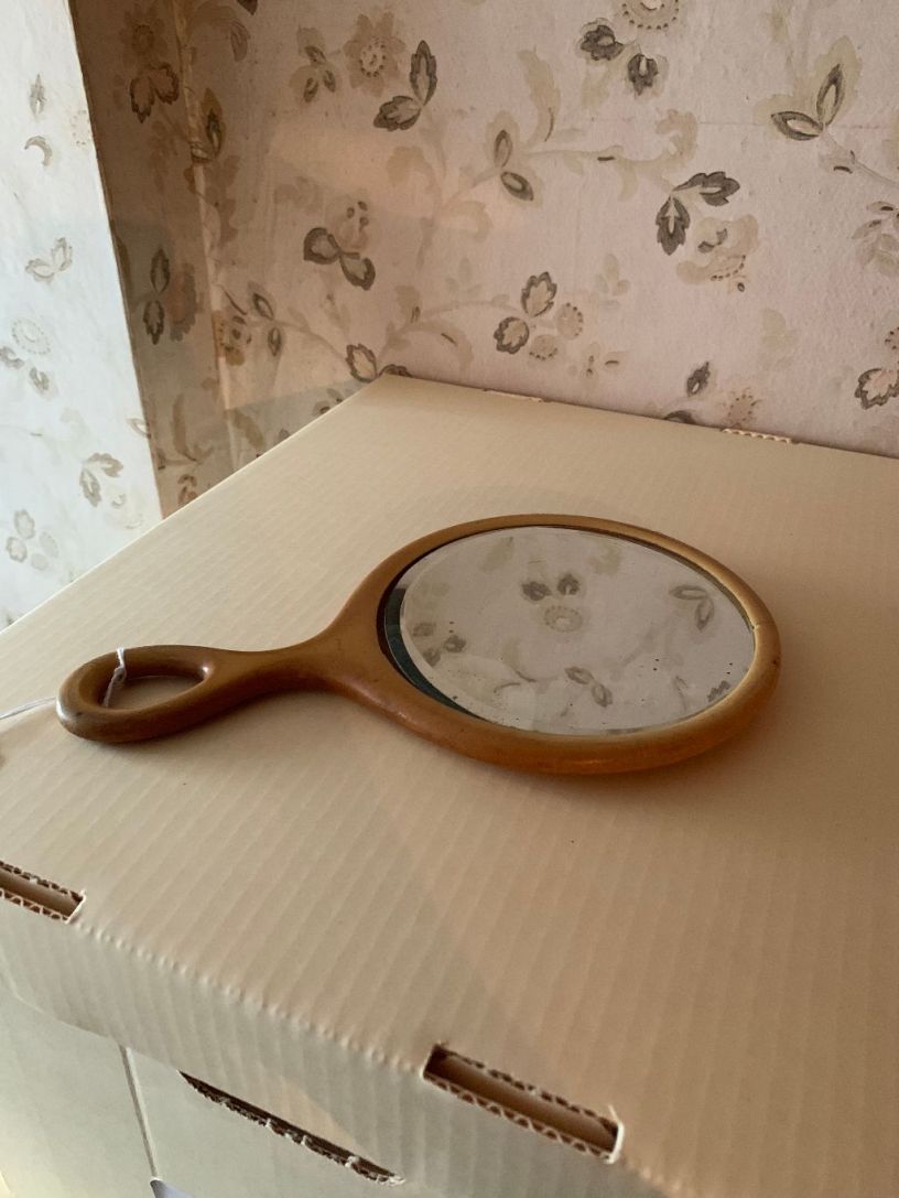 Description: wooden hand mirror;