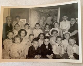 Description: b/w photograph, April 1, 1956, kindergarten class of Presbyterian Church Sunday School, Jackson Ohio, all names are completely identified on reverse side, includes teachers Miss Ella Evans and Mrs. Theodore (Evalyn…correct sp)) Gahm.