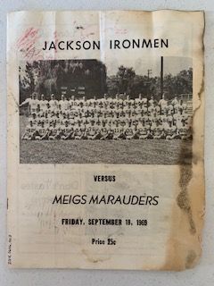 Description: one Sept. 19, 1969 football program, Jackson Ironmen versus. Meigs Marauders, mold stains with edges frayed, contains photos of team members, cheerleaders, managers and Jackson business advertisements;