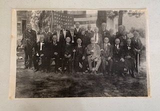 Description: b/w oversized photo copy, slight mold on paper, no date, no names, 22 men, one man in uniform, others in suits, all with bouteneries, 48-star US flag in background, 2 swords and 3 canes visible, trees and grass in background, possible military reunion.