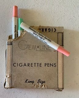 Description: promotional ink pen pieces for Denney’s Sohio Services, Main & Carr St., Jackson, Ohio, phone 9485, GEM LINE Cigarette Pens inside original package, 9 pens.