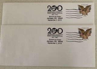 Description: two envelopes purchased by Director Malone when US Postal Service representative stamped the Jackson County Bicentennial Station postmarks on the Jones Museum grounds as part of Jackson County 150.