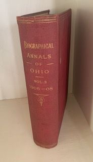 Description: b/w book with photographs, maroon hardcover binding, Vol. 3, The Biographical Annals of Ohio 1906-1907-1908 A Handbook of the Government and Institutions of the State of Ohio, front cover stamped “Compliments of Jas.O.Hawkins, Jackson County, Ohio House of Representatives”.