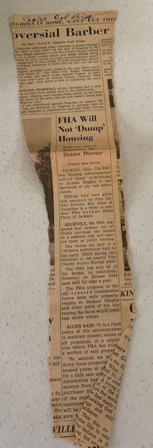Description: Columbus Dispatch newspaper clipping with headline of “FHA Will Not ‘Dump’ Housing Jackson Given Assurance By District Director” regarding housing in Jackson Heights, article dated 5/26/63