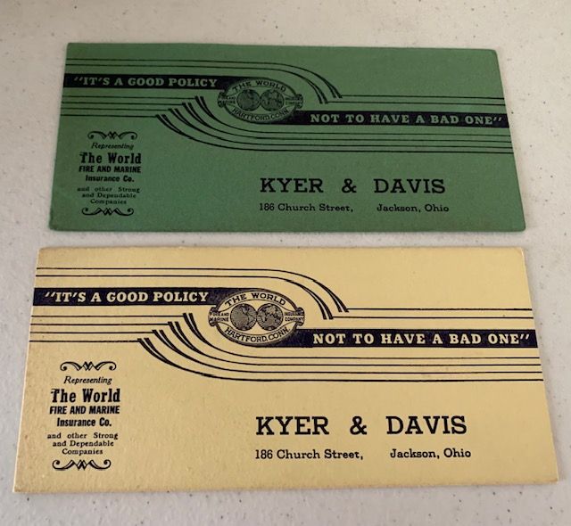 Description: undated promotional cards for Kyer&Davis of 186 Church Street, Jackson, Ohio representing The World Fire and Marine Insurance Co.; “It’s a good policy not to have a bad one” slogan; green and yellow cards, deed of gift form indicates a third pink card donated but not found with other two.
