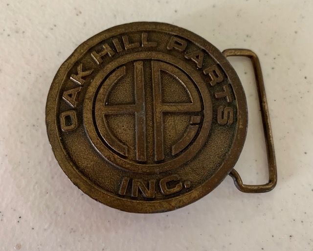 Description: belt buckle, Oak Hill Parts Inc. with insignia.