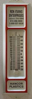 Description: white metal outdoor thermometer, black text, Ron Evans Enterprises, Jackson, Ohio 45640, 614-286-5930, 1-800-537-9528, orange trim on metal, bottom square says Hancor Plastics.