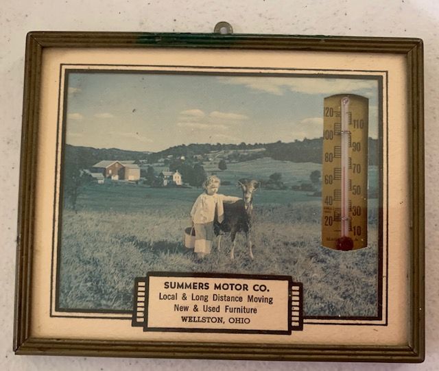 Description: full color framed thermometer, promotional piece for Summers Motor Co. of Wellston, Ohio, local & long distance moving, New & used furniture.