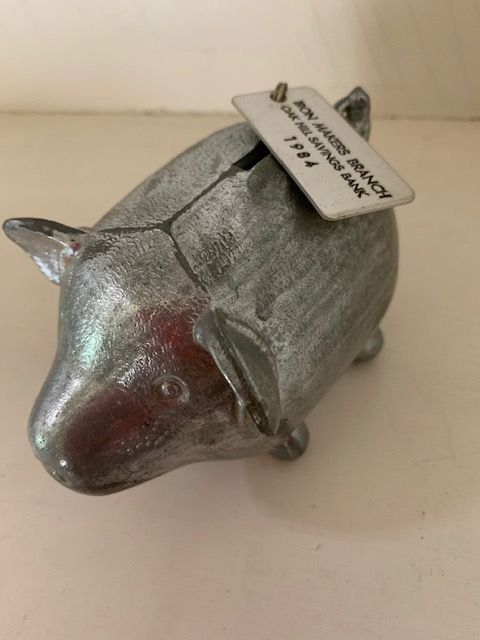 Description: small gray metal piggy bank from Oak Hill Bank Iron Maker’s Branch promotional item.