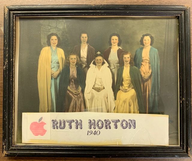Description: black framed photo of Queen Ruth Horton 1940 and six attendants, all identified, colorized photo 8×10.