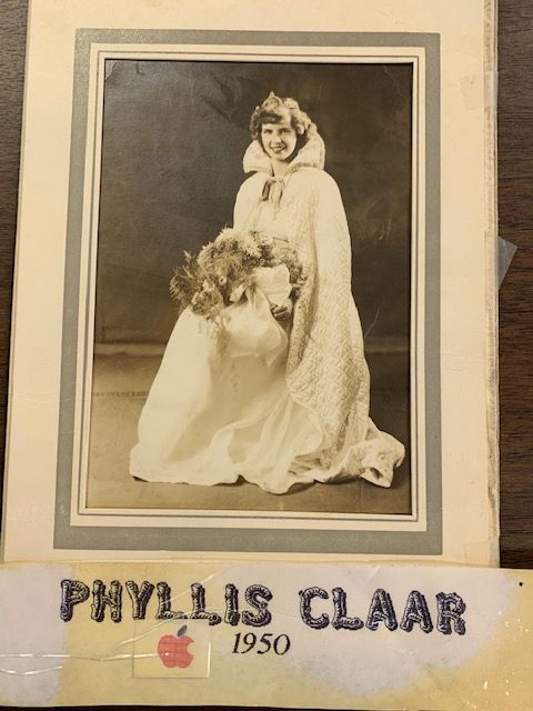Description: b/w photograph 8×10 of 1950 Queen Phyllis Claar in crown, cape, long dress with flowers on her lap.