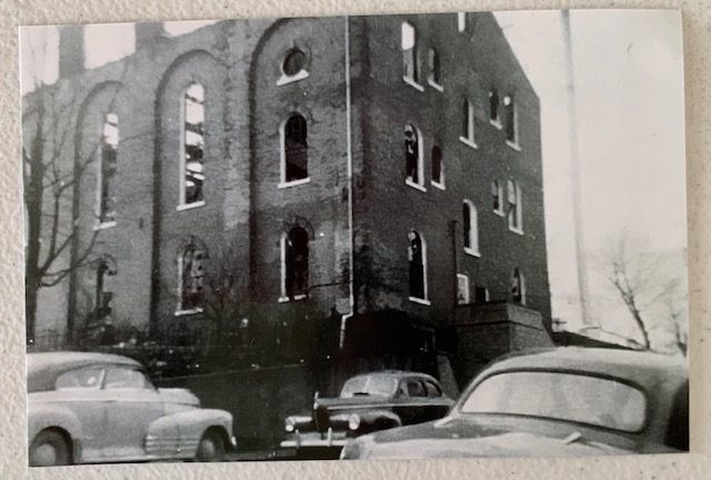 .024: b/w glossy print photograph, 5×7 horizontal, taken after fire from back side of courthouse, rafters and sky visible, windows burned out, cars in photo.