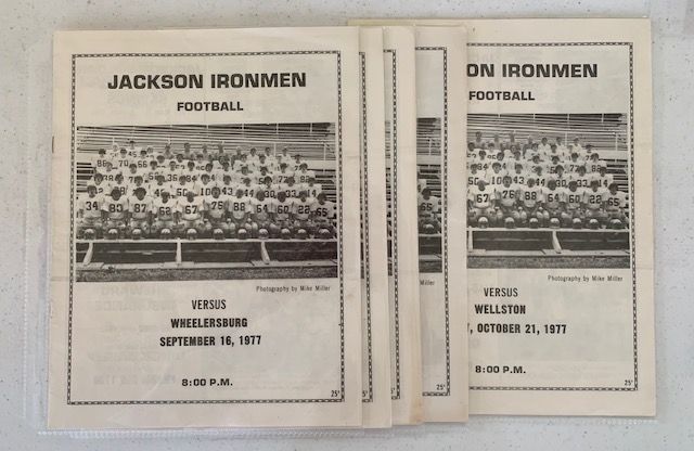 Description: Five home game programs for the 1977 Jackson HS football season (Wellston, Logan Elm, Waverly, Meigs, Wheelersburg), all b/w text and photographs, student names and advertisements.