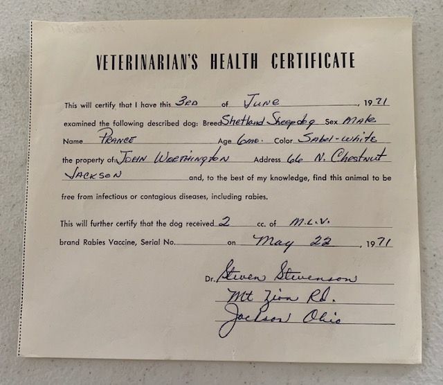 Description: Veterinarian’s Health Certificate for dog Prance from Dr. Steven Stevenson on Mt. Zion Road in Jackson Ohio, including rabies vaccine certification. Worthington daughters did 4-H projects involving dogs and this paperwork was required.