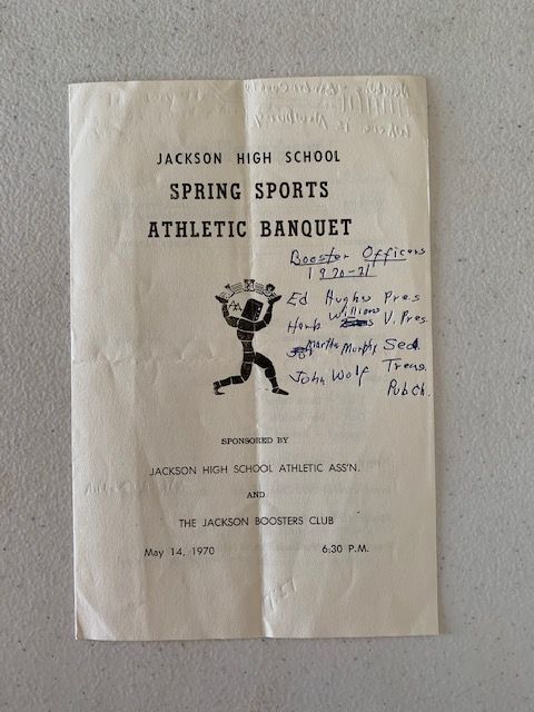 Description: the 1970 spring sports banquet program for Jackson High School, lots of names of students and coaches, no photographs, some handwritten notes on program b/w type.