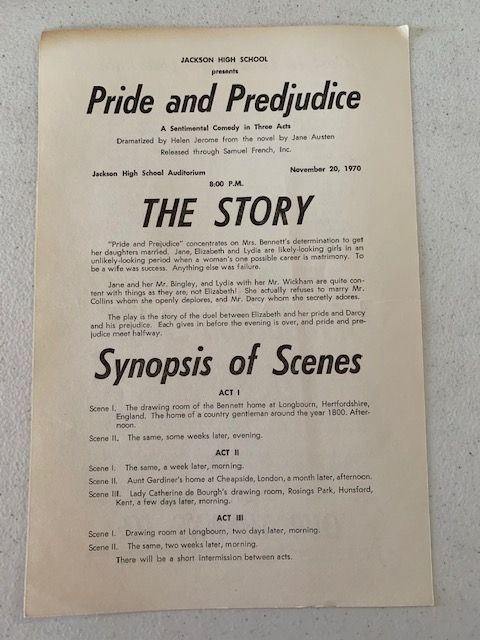Description: oversized b/w play bill for Jackson HS producation of Pride and Predjudice with names of actors, no photographs.