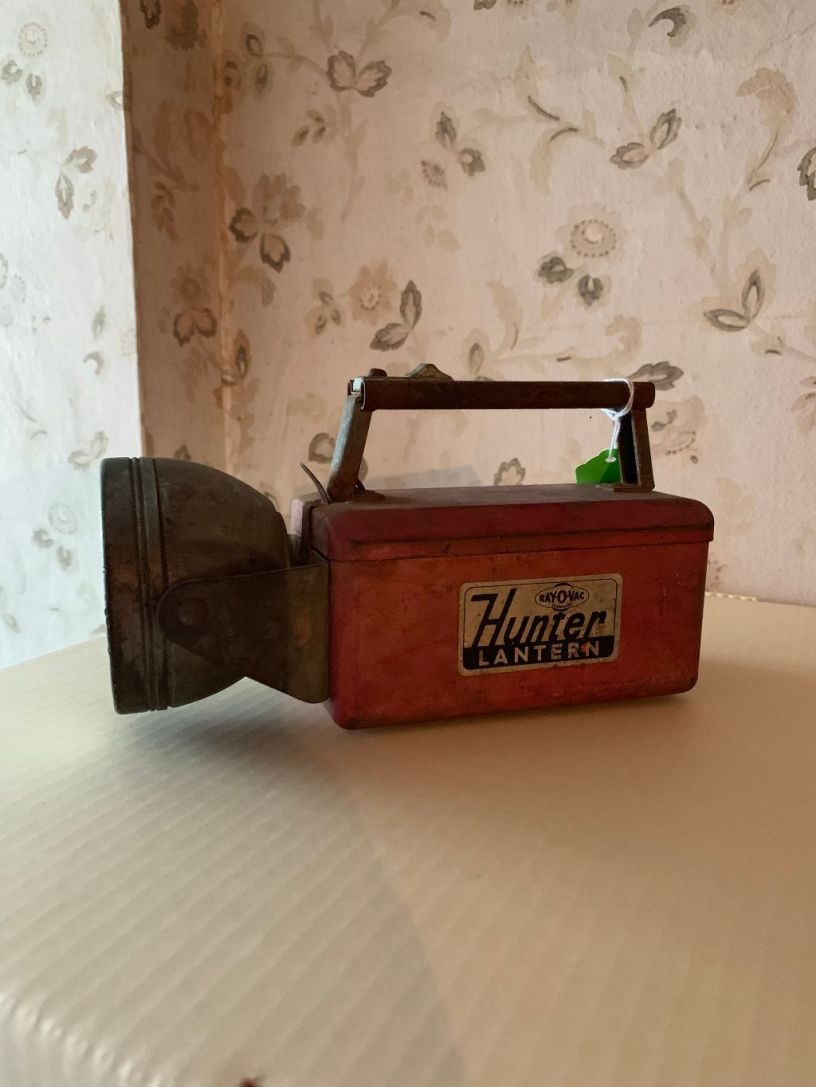 Description: red metal Hunter lantern, Ray-O-Vac battery powered, metal handle