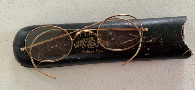 Description: wire/gold plated eye glasses with bifocal lenses (.01) and original black storage case marked L.T. Fenning Jeweler and Optician Jackson Ohio in gold colored text (.02). Original owner was grandfather of Herman P. Grow (1924-2005).