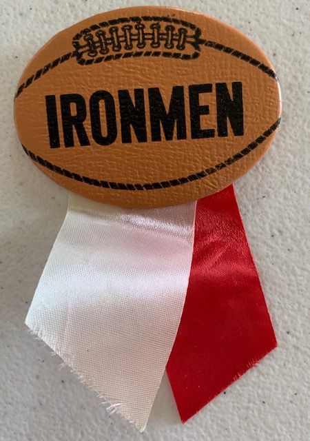 Description: Ironmen “spirit pin” with red and white ribbon, sold to students at Jackson High School; orange football with black lettering.