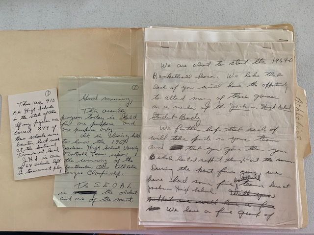 Description: manila folder of Mr. Worthington, mostly handwritten notes for JHS announcements, SEOAL papers and speeches, marked Athletics on folder tab.