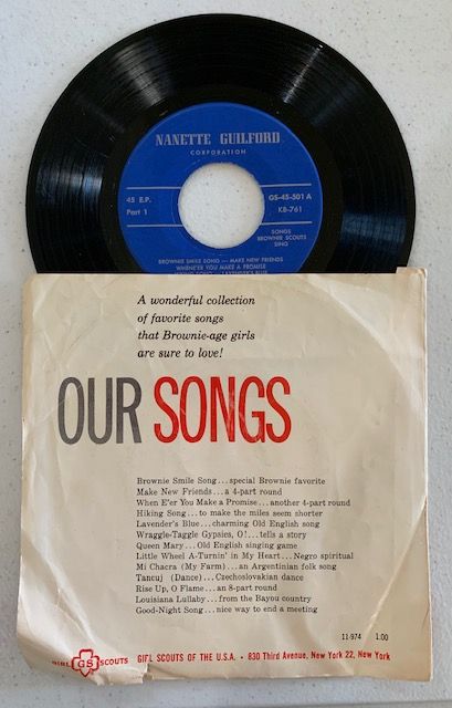 Description: 45rpm record, Our Song – Songs Brownie Scouts Sing with original cover, no date, belonged to Mary Ann Worthington who was a Girl Scout in Jackson.