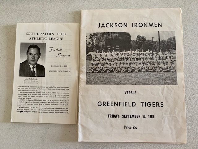 .230 a,b,c,- three copies of Southeastern Ohio Athletic League football banquet, Dec. 4, 1969 held at Jackson High School with speaker Lou McCullough from Ohio State University, Most Valuable Player Darwin Valentine of Jackson HS, Coach of the Year Ben Buckles of Jackson HS.