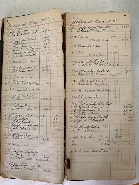 Description: business ledger book from Cavett and Jones Men’s Clothing store, located on Main Street between Broadway and Church streets; 15.5×7.5 inches, handwritten pages April 1898-Nov. 1905, front and back covers and some pages removed from binding.