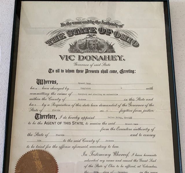 Description: 1 of 3 framed papers related to Walter McCoy’s tenure as Jackson County Sheriff. This document is paperwork to transport Ernest Ganz from Florida to Jackson for trial of burglary and stealing an automobile. signed by Ohio Governor Vic Donahey with Ohio seal and Ohio Secretary of State Thad N Browne.