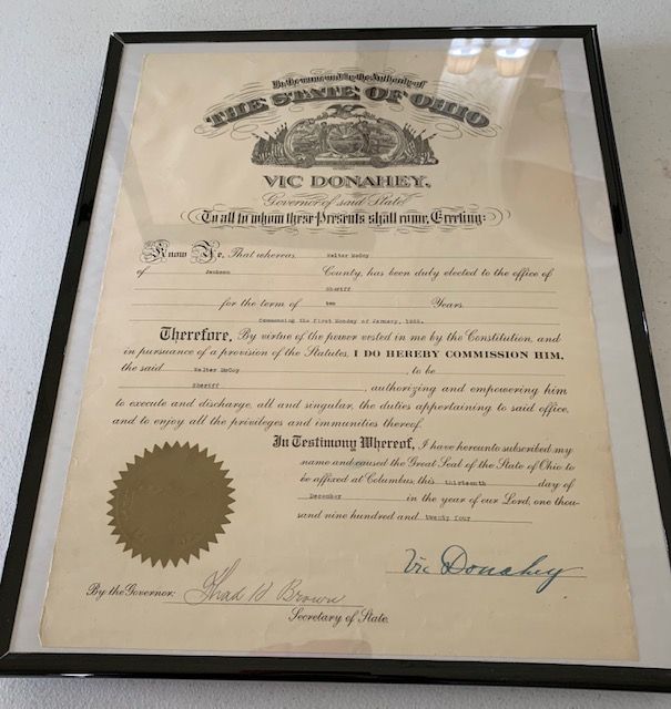 Description: 1 of 3 documents pertaining to Walter McCoy’s tenure as Jackson County Sheriff. This document states McCoy’s election as Sheriff for a two-year term commencing the first Monday of January 1925 and commission by Ohio Gov. Vic Donahey as of December 13, 1924. Signed by Gov. Donahey and Secretary of State Thad H. Browne