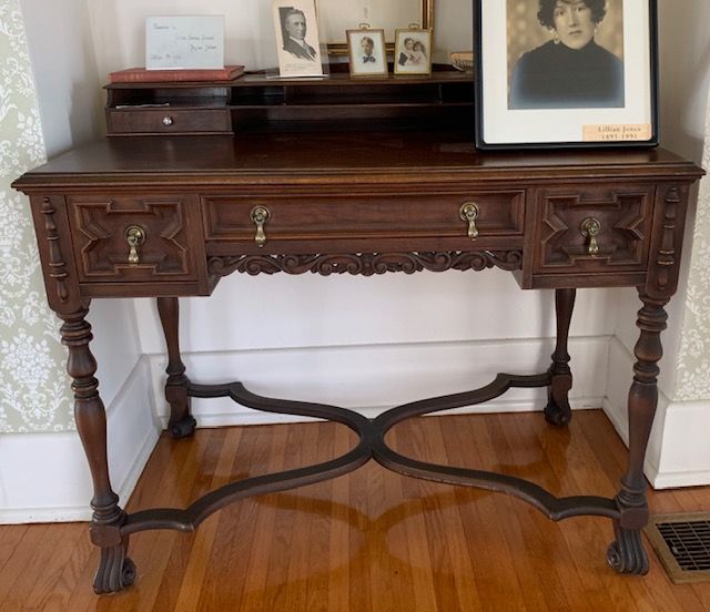 Description: Ladies writing desk; reproduction made of walnut wood; recessed box on the back of top with open pigeon holes and small drawers on either side with tiny brass knobs, one center dove-tailed drawer with open carved apron below; small drawer on either side with brass drop pulls; four turned legs ending in Spanish scrolled feet joined by serpentine incurved stretcher; height 30.5 inches x 40 inches wide x 23 inches depth; all as noted in 1991 appraisal as item # 206