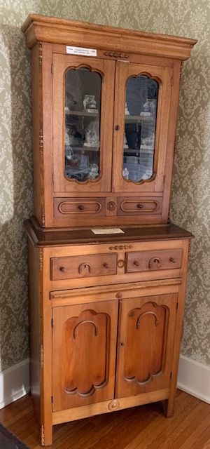 Description: Two Piece Wall Cupboard, “Secretary Style”; Antique – Recessed Secretary – China Cupboard Top; 9 x 26 x 15.5 with glass; Flat top with two glass doors reveal fitted interior of eight pigeon holes (serpentine dividers) and a long open shelf across the top. Two small half drawers below with small turned wooden knobs. Oval molding. Bottom Section: 15.5 x 28.5 x 38 inches high, two half drawers across the top with two cupboard doors below with cut-out panels and decorative trim. Chamfered sides with decorative pieces terminating in squared feet. Solid ends. Escutcheons. Combination of light woods; pine, butternut, ash, etc.