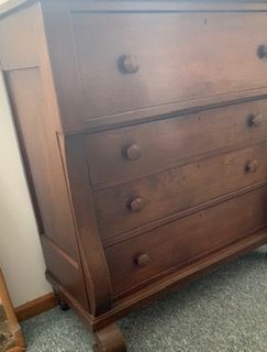 Description: “Empire” Chest of Drawers; Antique – Deep top drawer overhangs three long graduated size dove-tailed drawers below; Paneled ends; C Scrolled legs – brass escutcheons and turned wooden knobs; Maghoany finish, 19x 43x 45 inches high; “American”- all as notated in 1991 appraisal, item #193.