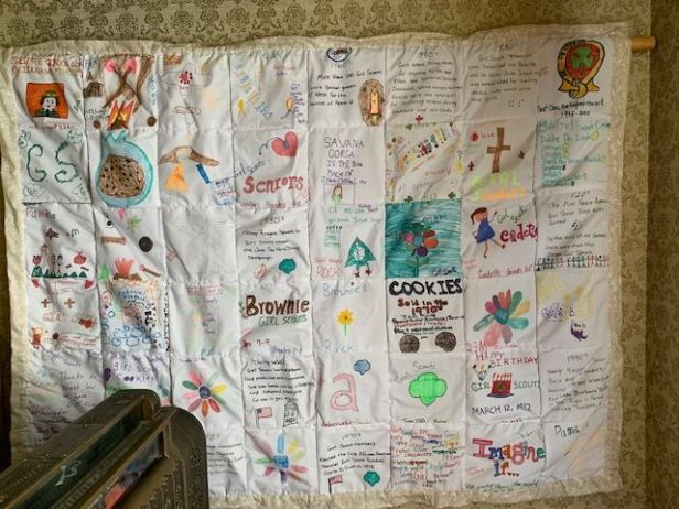 Description: hand-painted and stitched quilt depicting various historical events that involved Girl Scouts. Hand-stitched by Cathy Garvey’s mother Irene Whaley.