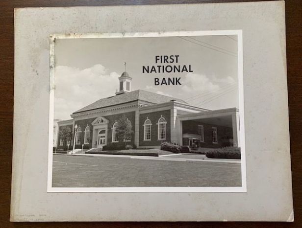 Description: b/w photograph mounted on fiberboard, 1 of 9 photographs donated together with similar mounting style, pictured is Jackson’s First National Bank, 160 Broadway Street featuring drive-through which was later closed circa 1990s.