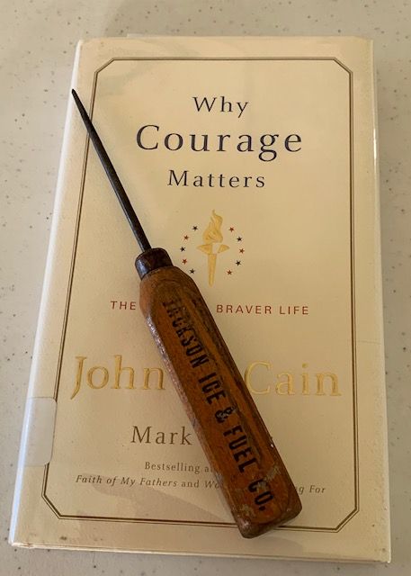 Description: (.100) personal size ice pick as a promotional item from the Jackson Ice & Fuel Co., wooden handle with advertising names, metal pick; (.101) John McCain’s 2004 book “Why Courage Matters”, mentions of Jackson Ohio in chapter pages 52-56 about John Wesley Powell and his childhood, withdrawn from Wellston library.