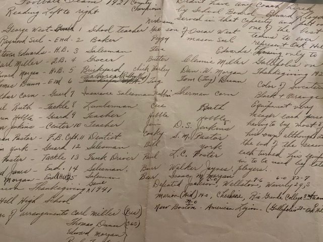 Description: handwritten account of Thanksgiving 1941 reunion of Oak Hill High School’s 1921 county champion football team. Lamar Jenkins, father of donor, was the center on the team. Includes names, positions, and occupations of players as well as description of season.