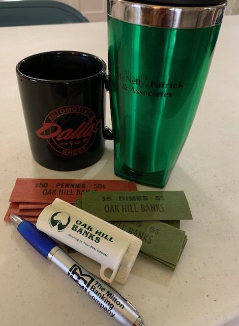 .100 coin wrappers from Oak Hill Banks Five, penny wrappers (red) and Ten dime wrappers (green); .104 Oak Hill Banks white plastic toothpaste squeezer; .101 Milton Banking Company ink pen, silver and blue; .102 McNelly Patrick and Associates travel mug, green, given to her with her insurance while employeed by Jackson City Schools; .103 Dallas Automotive Group black ceramic mug with red ink, given to her after she bought a car from Dallas Chevrolet.