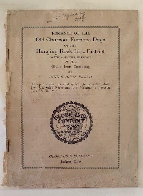 .002: paper booklet, Romance of the Old Charcoal Furnace Days, the text of a talk in Jackson, Ohio given by John E. Jones, then president of Globe Iron Company.