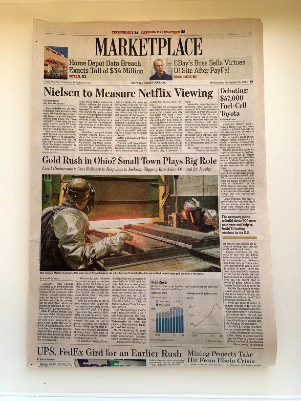 Description: full size Marketplace section of Wall Street Journal with story written by John W. Miller with headline “Gold Rush in Ohio? Small Town Plays Big Role” with subhead “Local Businessman Uses Refinery to Keep Jobs in Jackson; Tapping Into Asian Demand for Jewelry.” with color photo and story about Ohio Precious Metals LLC.