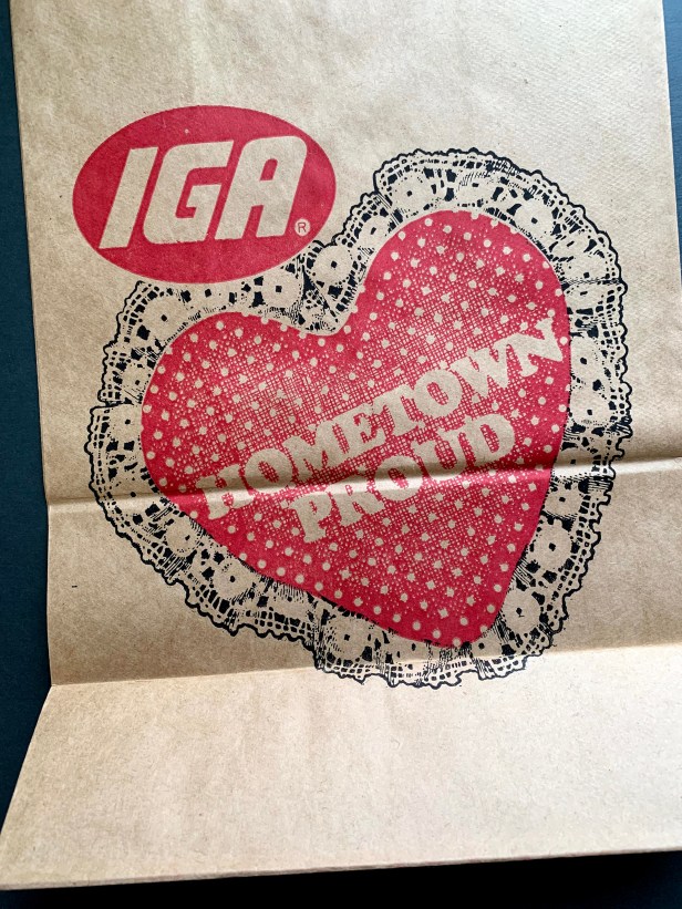 Description: brown paper grocery bag, red heart with green outline with white text, IGA HOMETOWN PROUD.