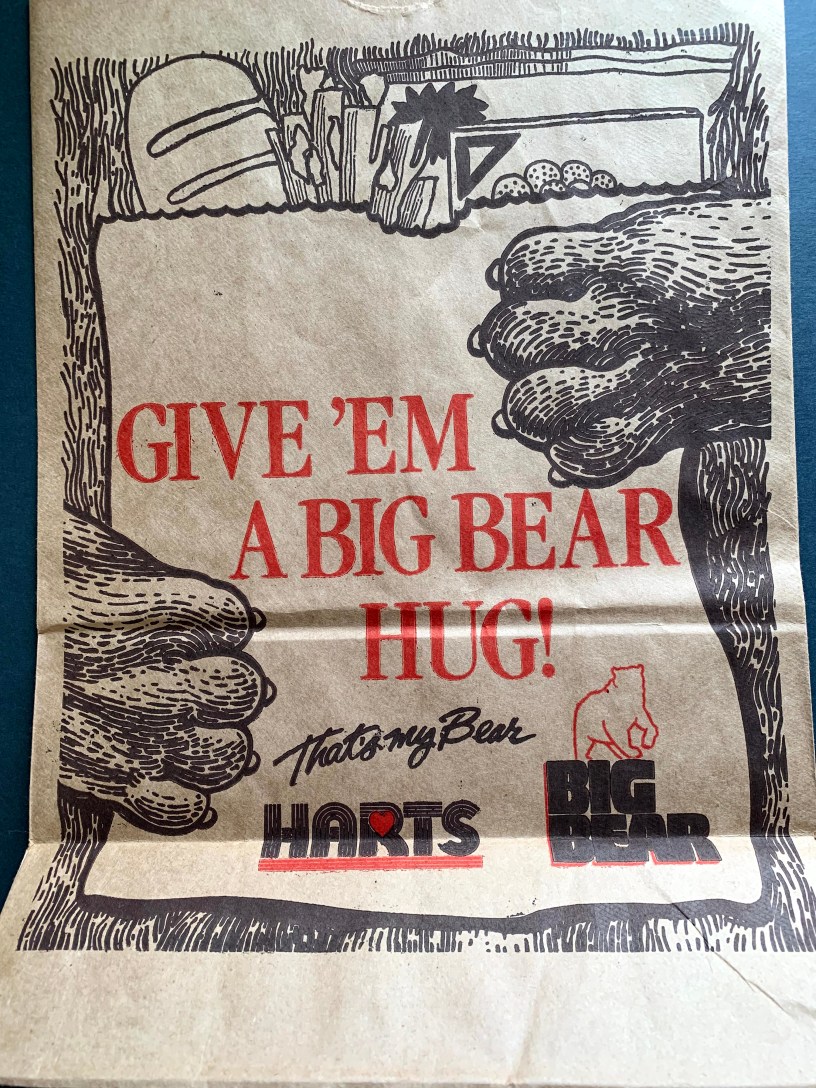 Description: brown grocery bag, with black bear hug fingers surrounding a grocery bag with images of bread and groceries and red text “Give Em A Big Bear Hug!” followed by black text ‘That’s my Bear’ and all caps BIG BEAR and red outline of a bear, also HARTS in black underlined in red.